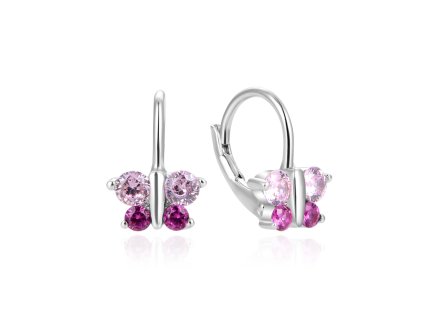 Slušivé stříbrné náušnice se zirkony Motýlci Náušnice s něžným motivem motýlků zaujmou třpytivými růžovými a hnědými zirkony, které dodávají šperku hravý a veselý vzhled....