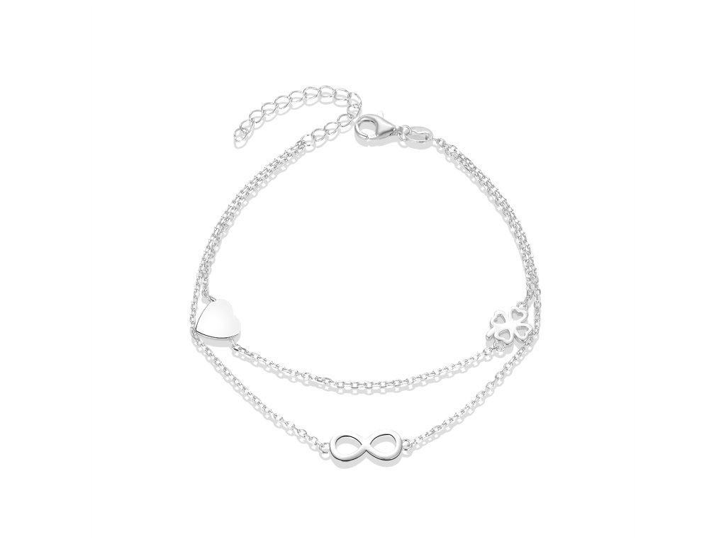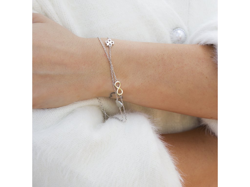 Jeden řetízek zdobí symbol nekonečna, druhý dekorují srdíčko a čtyřlístek jako talisman lásky a štěstí. Náramek je vyroben z pravého stříbra a opatřen rhodiovaným povrchem, který uchovává jeho třpyt a snižuje riziko alergických reakcí. Díky nastavitelné délce 17–21 cm padne pohodlně na každé zápěstí.
