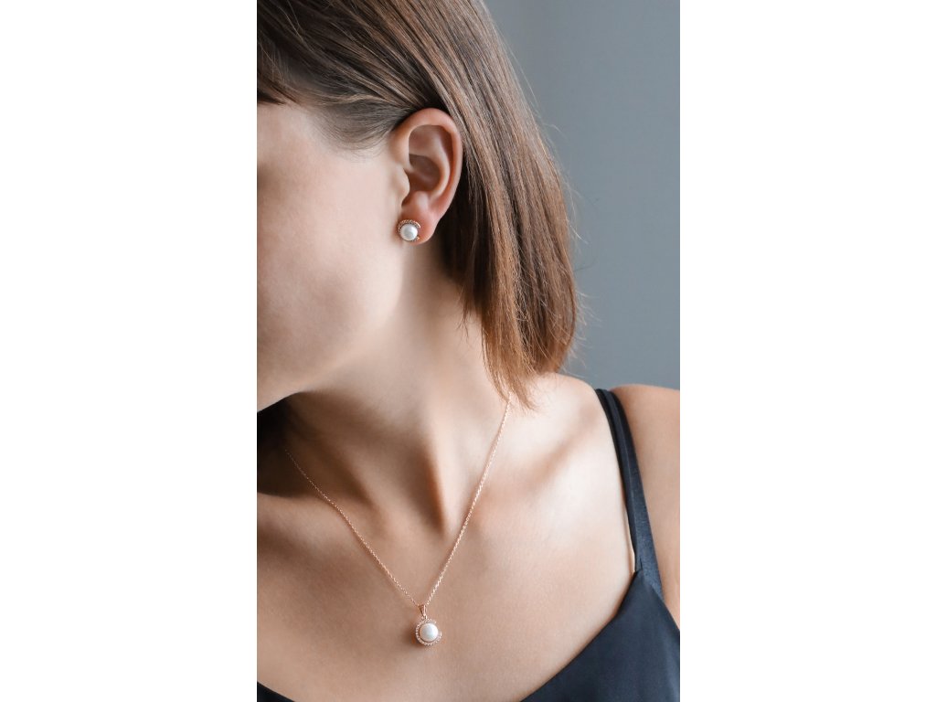 Tato souprava kombinuje náhrdelník a náušnice z kvalitního stříbra ryzosti 925/1000, pozlaceného růžovým zlatem, s pravými sladkovodními perlami a čirými zirkony. Náušnice se pohodlně nosí a náhrdelník dokonale sedí, takže celý set působí jemně, nadčasově a luxusně. Ideální volba pro ženy, které chtějí podtrhnout svůj styl a pocit výjimečnosti.