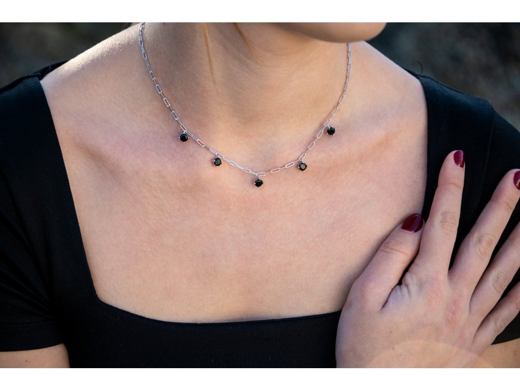 Na jemném stříbrném řetízku se třpytí precizně broušené černé zirkony, které odrážejí světlo při každém pohybu. Délka náhrdelníku je 42 cm s možností prodloužení o 5 cm, takže pohodlně padne každé ženě. Je ideální pro ty, které milují eleganci, originalitu a jemný třpyt.
