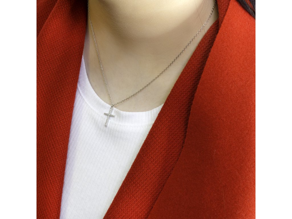 Na jemném stříbrném řetízku vyniká přívěsek v podobě klasického křížku, osazený precizně broušenými čirými zirkony. Šperk působí čistě, elegantně a snadno se kombinuje s dalšími doplňky. Je ideální volbou pro ženy, které mají rády symbolické šperky, jemnou eleganci a nadčasový design.