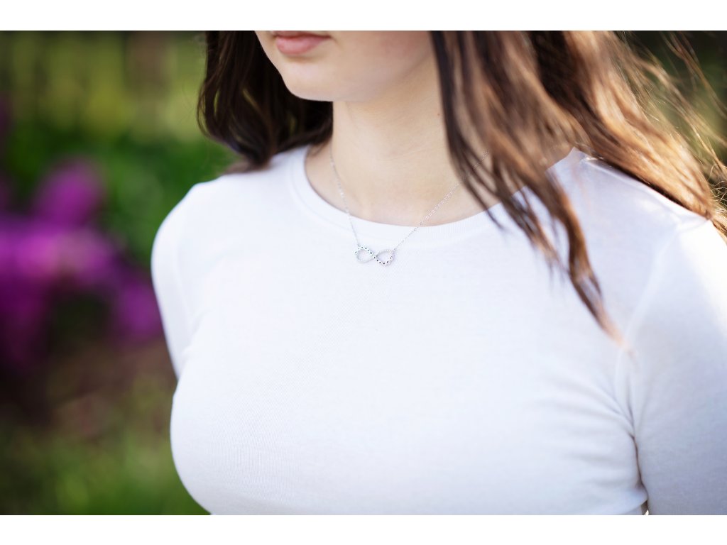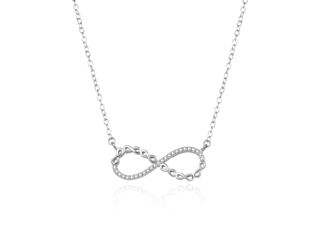 Dominantou šperku je symbol nekonečna, dekorovaný drobnými precizně broušenými zirkony, které se nádherně lesknou. Jemný stříbrný řetízek má délku 42 cm s možností prodloužení o 5 cm, takže skvěle padne každé ženě. Ideální volba pro ženy, které hledají šperk s významem.