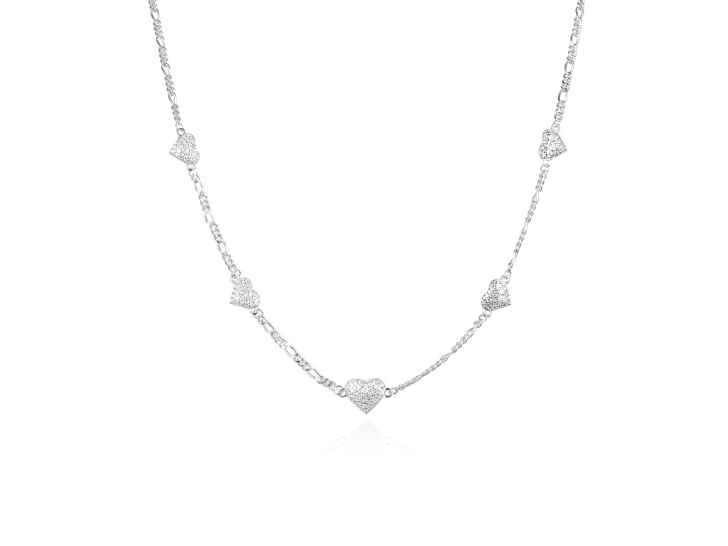 Ozdoby ve tvaru romantických srdíček jsou bohatě dekorované precizně broušenými čirými zirkony, které se nádherně lesknou. Jemný stříbrný řetízek má délku 42 cm s možností prodloužení o 5 cm, takže se přizpůsobí každé ženě. Tento šperk je skvělým způsobem, jak vyjádřit lásku a něžnost, a stane se oblíbeným kouskem vaší šperkovnice.