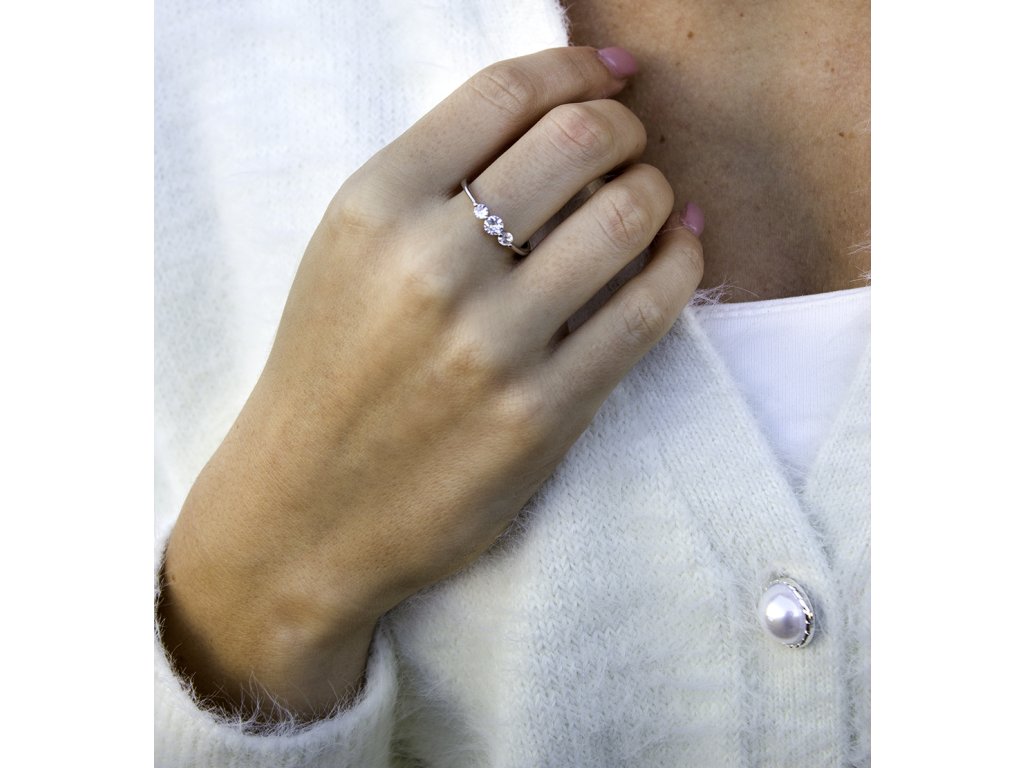 Prsten je vyroben z velmi kvalitního stříbra a zdoben třemi třpytivými zirkony, které zachycují světlo a dodávají oslnivý třpyt. Rhodiovaný povrch snižuje alergie a udržuje dlouhotrvající lesk šperku. Spojením jemnosti a elegance dává tomuto prstenu výjimečný charakter.