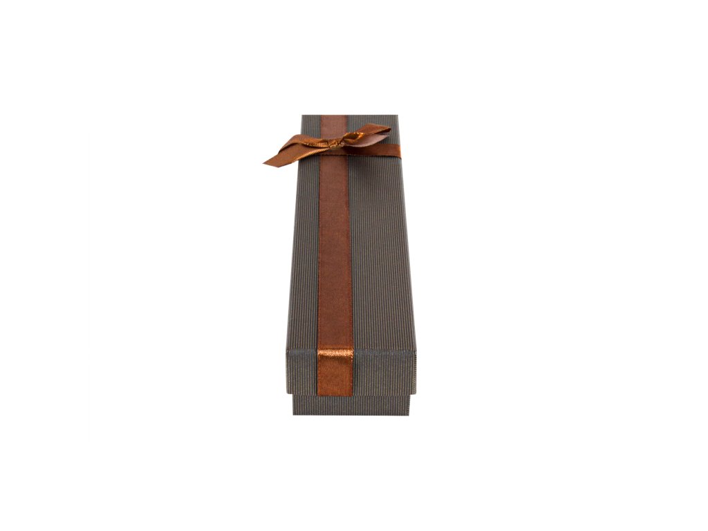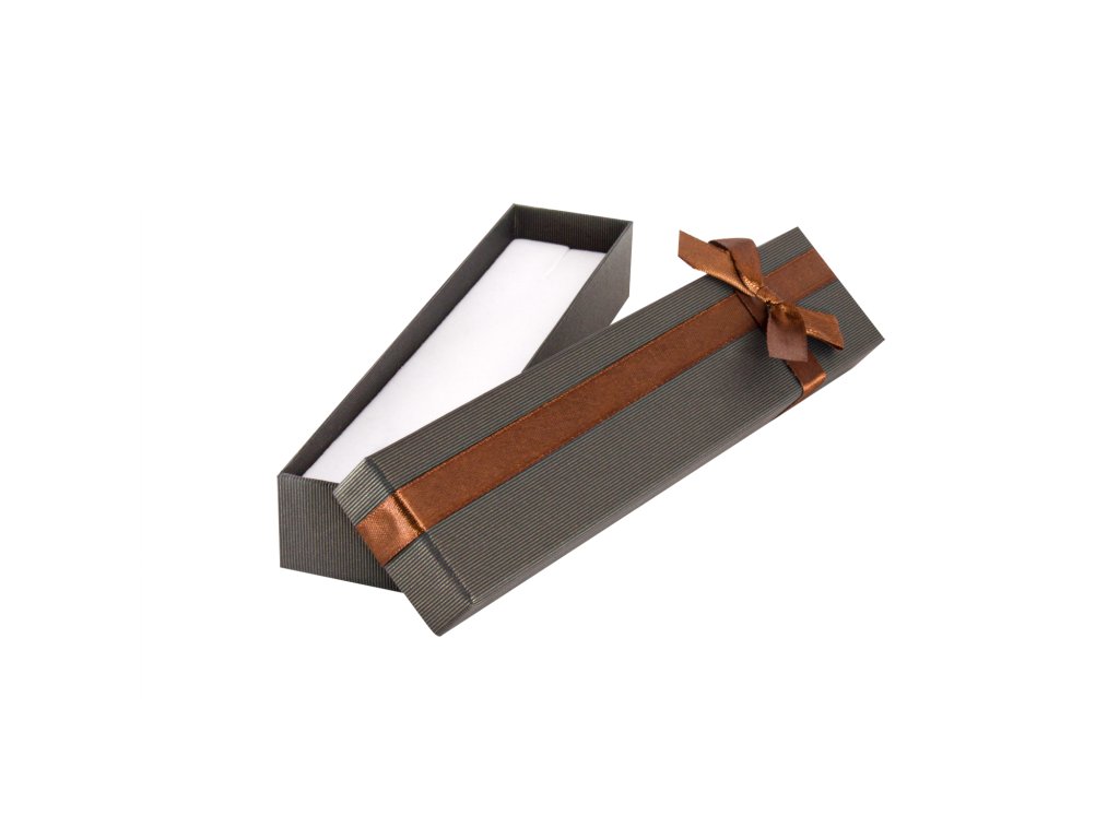 Vroubkovaná pevná papírová dárková krabička je ideální pro uložení náramku, řetízku i náhrdelníku. Uvnitř se nachází měkká bílá poduška a víčko zdobí krásná hnědá mašlička.