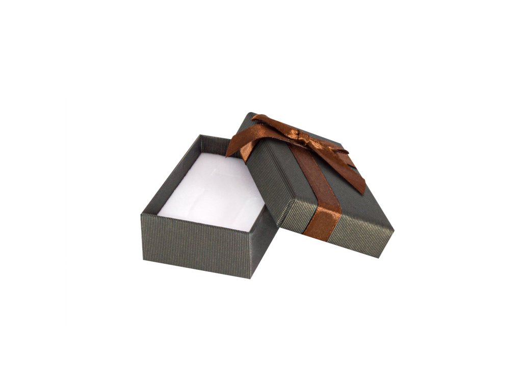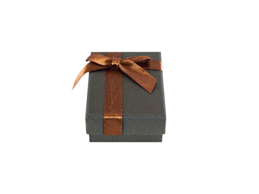 Vroubkovaná pevná papírová dárková krabička je ideální pro uložení náhrdelníku nebo větších náušnic. Uvnitř se nachází měkká bílá poduška a víčko zdobí elegantní hnědá mašlička.
