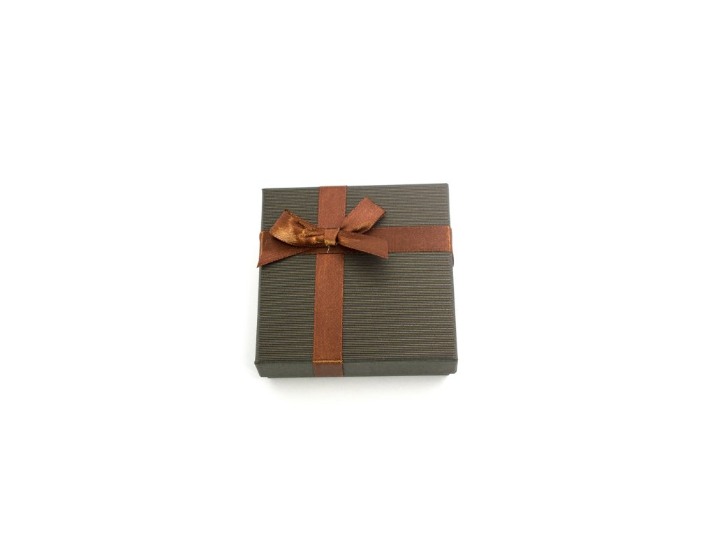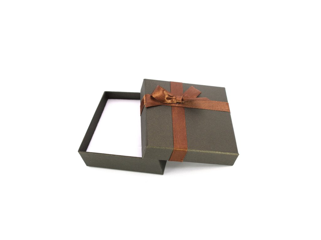 Vroubkovaná pevná papírová dárková krabička je ideální pro uložení setu šperků. Uvnitř se nachází měkká bílá poduška a víčko zdobí krásná hnědá mašlička.