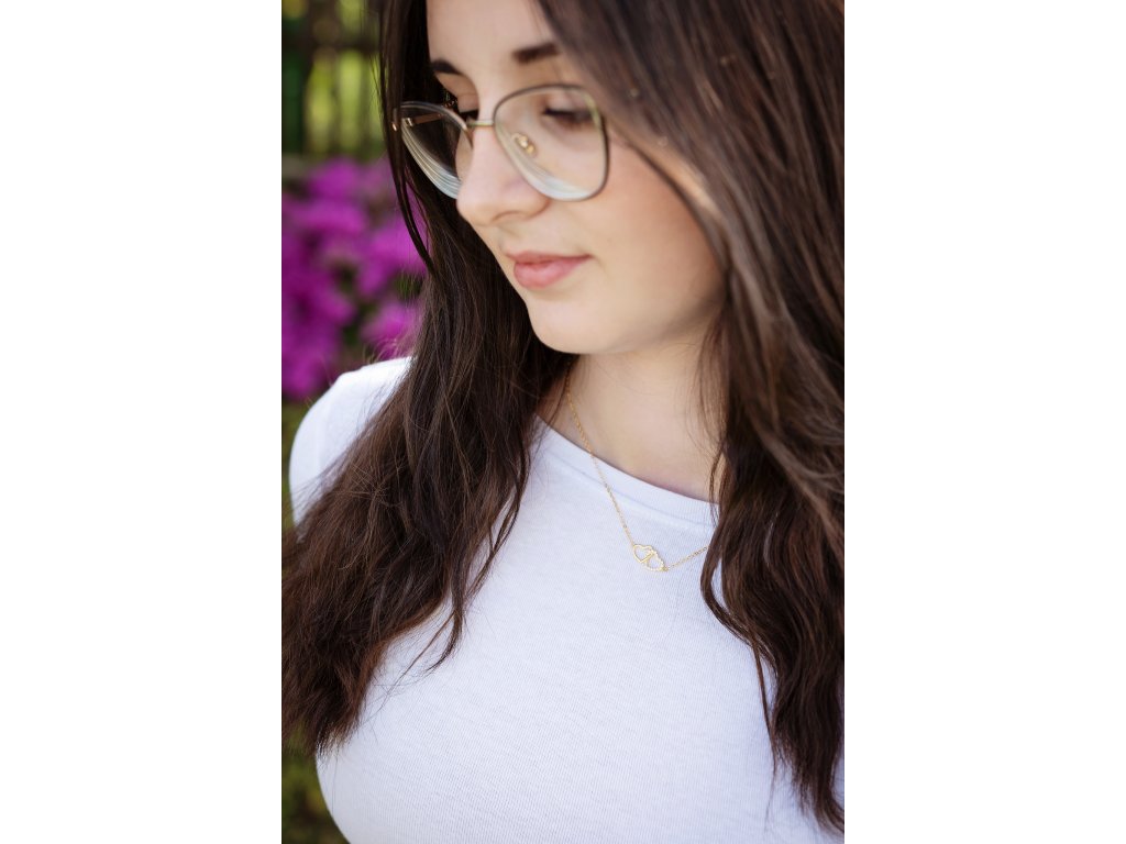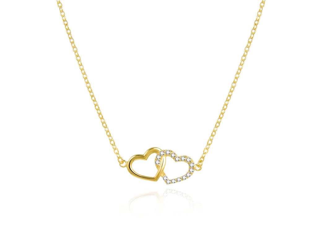 Dominantou je ozdoba tvořená propojenými srdíčky, z nichž jedno je dekorováno precizně broušenými čirými zirkony. Jemný stříbrný řetízek pozlacený žlutým zlatem má délku 42 cm s možností prodloužení o 5 cm, takže se snadno přizpůsobí. Tento náhrdelník je krásným symbolem lásky a spojení, a skvěle se hodí i jako dárek pro výjimečnou osobu.