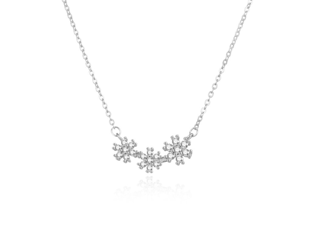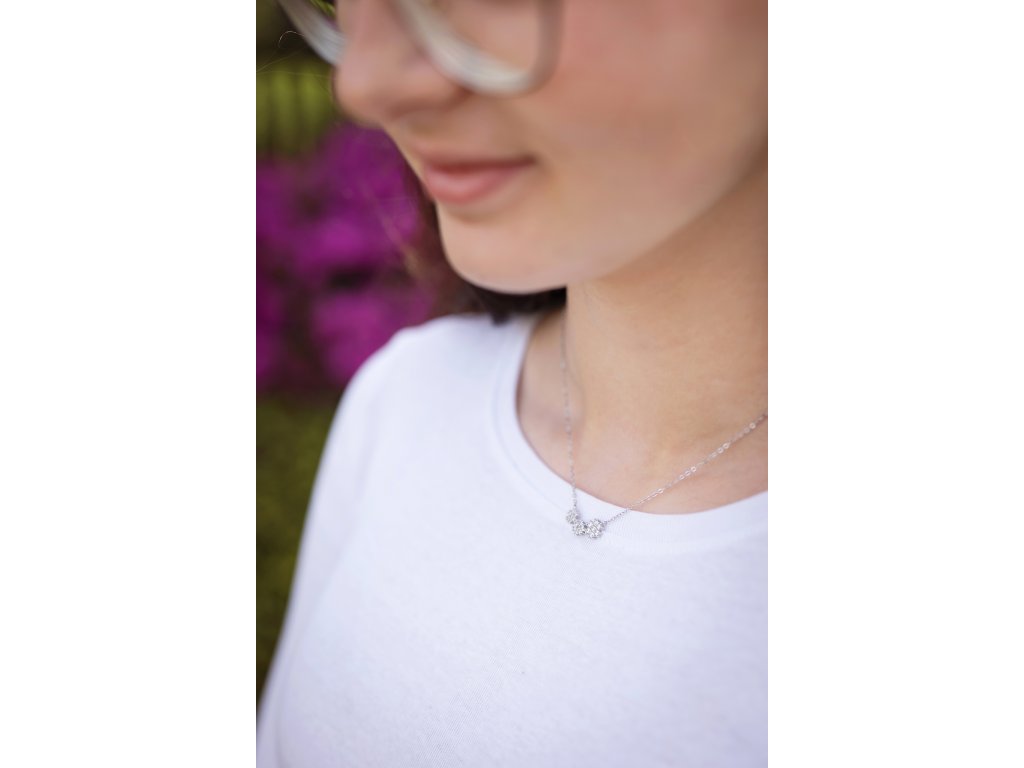 Na jemném stříbrném řetízku se vyjímají květinové ozdoby, dekorované drobnými zirkony, které se krásně lesknou při každém pohybu. Délku náhrdelníku lze nastavit na 42 cm s prodloužením o 5 cm, takže perfektně padne. Tento šperk vnese do vašeho stylu svěžest a romantický půvab.