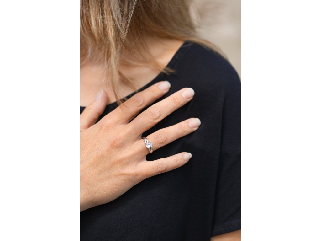 Vyroben ze stříbra, rhodiovaný povrch zajišťuje dlouhotrvající lesk a snižuje riziko alergických reakcí. Prsten je zdoben třemi třpytivými čirými zirkony, které oslnivě zachycují světlo. Díky své lehkosti a komfortnímu nošení je ideální pro každodenní nošení i slavnostní příležitosti, perfektní dárek pro milovanou ženu.