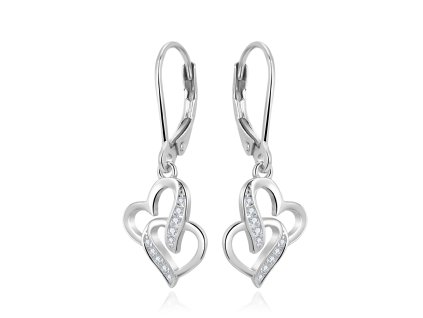 Propojená srdíčka – stříbrné náušnice se zirkony Delikátní šperk s přívěsky ve tvaru srdíček, jejichž propojení vytváří harmonický a elegantní efekt. Čiré třpytivé zirkony...