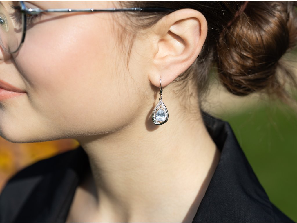 Náušnice jsou vyrobeny z kvalitního stříbra a vybaveny bezpečným zapínáním na klapku, které zajišťuje pohodlné a jisté nošení. Jemný pohyb visacího přívěsku zvýrazňuje třpyt kamenů a vytváří působivý efekt. Tento elegantní doplněk je určen pro ženy, které chtějí šperk kombinující sofistikovanost a výrazný detail.