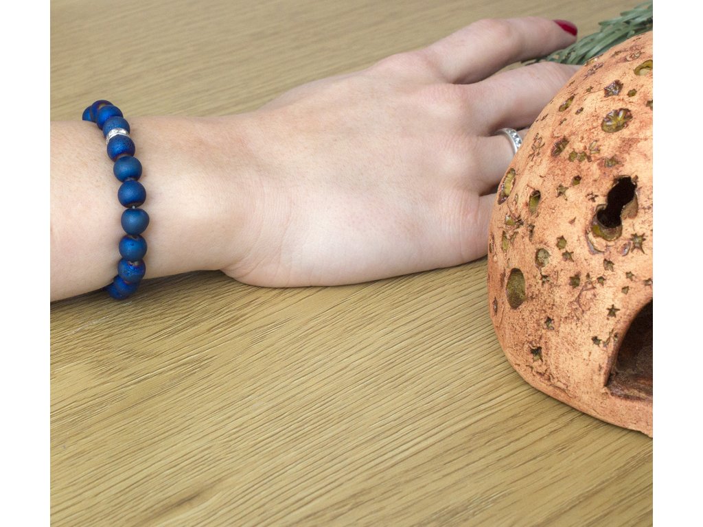 Díky pružné gumičce se náramek pohodlně nosí a snadno přizpůsobí zápěstí. Tmavě modrý achát podporuje vnitřní klid, koncentraci a harmonii, přináší pocit stability a vyrovnanosti. Náramek je vyroben ručně v České republice, každý kus je originál. Hodí se zejména pro znamení Vodnář, Ryby a Štír, a je ideální jako dárek, pro každodenní nošení, nebo pro chvíle, kdy chcete dodat svému vzhledu eleganci a pozitivní energii.