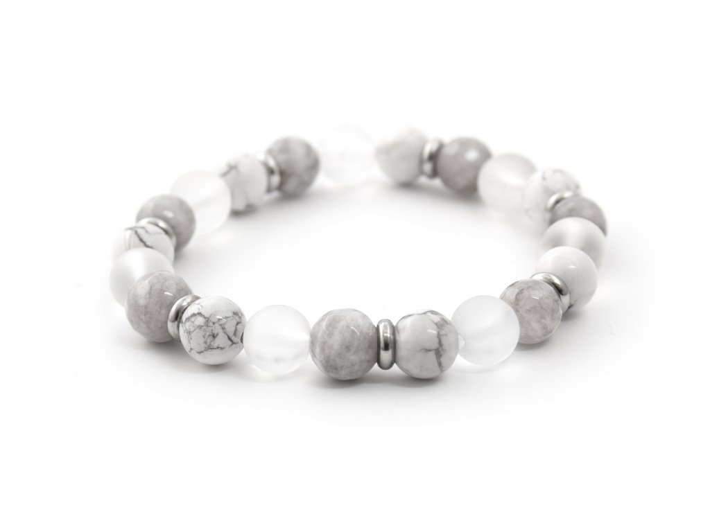 Díky pružné gumičce se náramek pohodlně nosí a přizpůsobí zápěstí. Howlit uklidňuje mysl, jadeit podporuje vnitřní rovnováhu a křišťál přináší jasnost a pozitivní energii. Náramek je ručně vyroben v České republice a každý kus je originál. Hodí se pro znamení Býk, Panna a Vodnář, skvělý jako doplněk, který podtrhne váš osobní styl a harmonii.