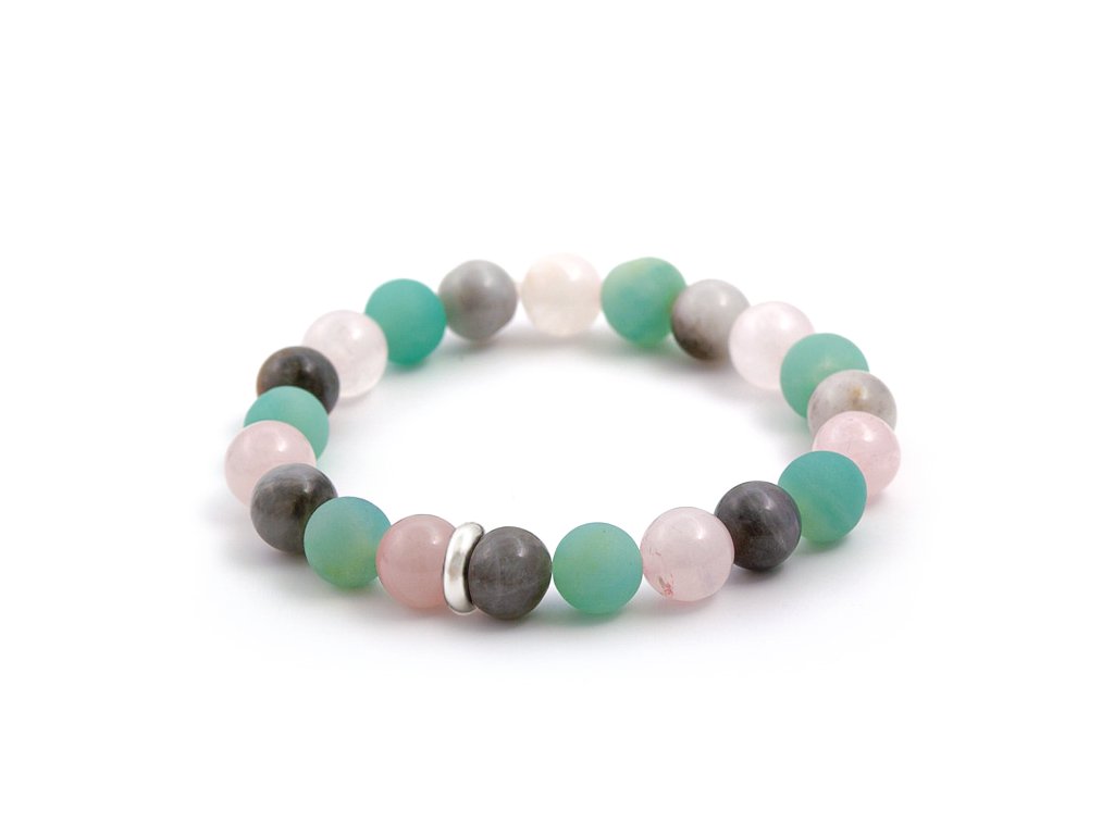 Tento náramek je ručně vyráběný v České republice, což zaručuje jeho vysokou kvalitu a pečlivé zpracování. Růženín přináší lásku a něhu, amazonit podporuje vnitřní klid a harmonii a labradorit dodává ochranu a tajemnou energii. Náramek je vhodný zejména pro znamení Váhy, Raka a Panny, ale svou krásou a energií osloví každého, kdo hledá rovnováhu a pozitivní vibrace. Skvělý tip na dárek i osobní doplněk.