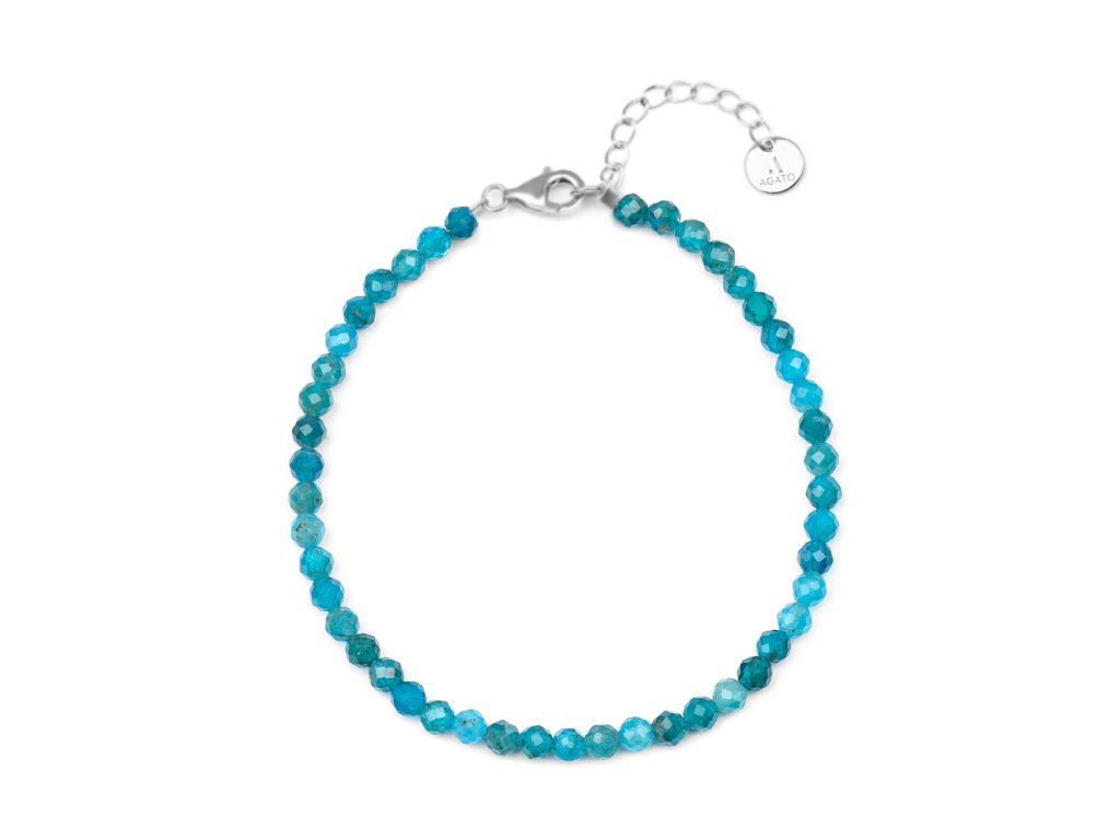 Apatit je kámen inspirace a harmonie, který podporuje sebedůvěru a soustředění. Náramek je tvořen z přírodního apatitu a díky zapínání na karabinku a možnosti prodloužení z 17 cm až o 3 cm se pohodlně nosí a přizpůsobí každému zápěstí. Hodí se zejména pro znamení Blíženců, Střelců a Vodnářů.