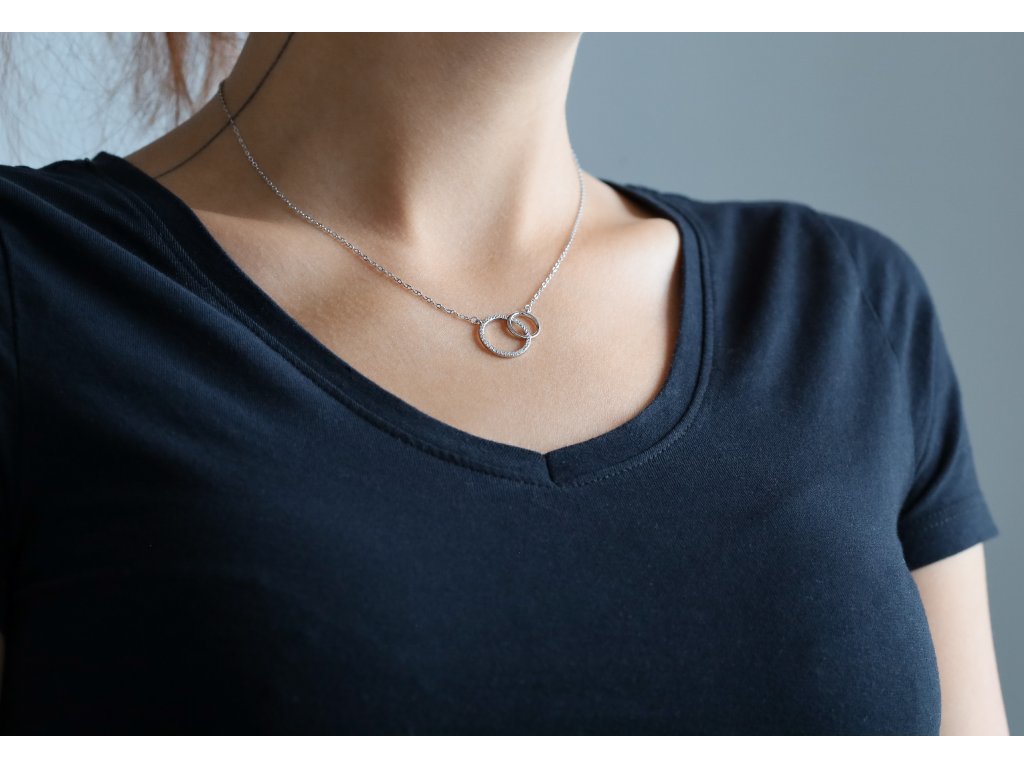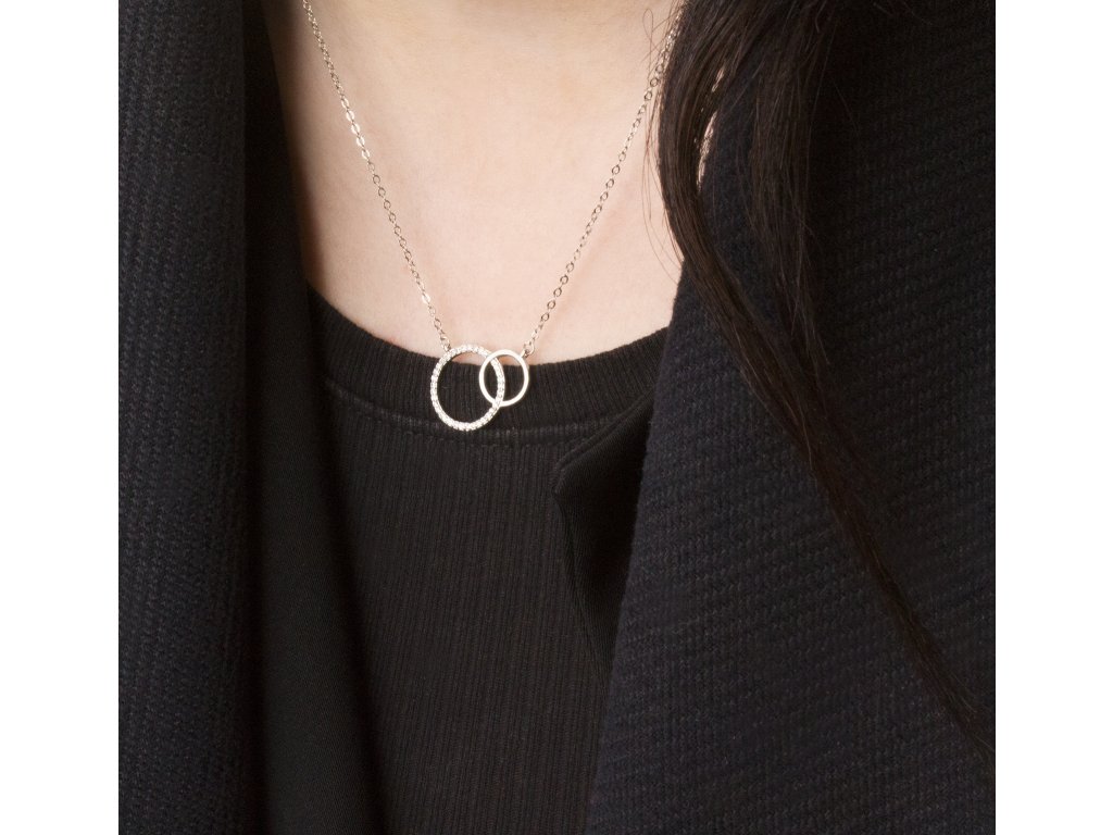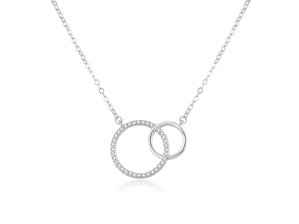 Dominantou je větší kruh zdobený čirými zirkony, který se třpytí při každém pohybu, zatímco druhý kroužek zůstává jemný a čistý. Náhrdelník je vyroben z pravého stříbra a jeho délku lze nastavit na 42 + 5 cm. Tento kousek skvěle kombinuje jednoduchost a zářivý lesk.