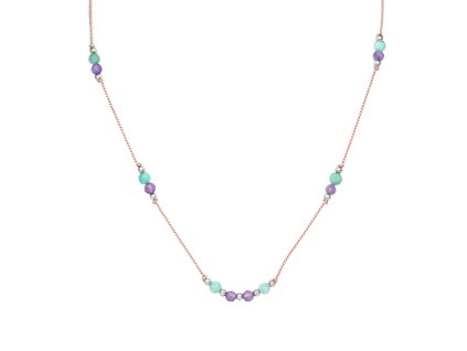 Šňůrkový náhrdelník s amazonitem, ametystem a angelitem Něžný a originální šperk, který propojuje jemný design a kouzlo přírodních minerálů. Růžová hedvábná šňůrka působí hravě...