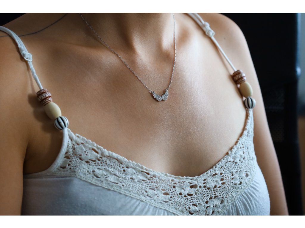 Šperk je vyrobený z kvalitního stříbra a zdobený křídly osazenými zirkony, které se nádherně třpytí při každém pohybu. Délku náhrdelníku lze nastavit na 42 cm s prodloužením o 5 cm, takže perfektně padne. Tento náhrdelník dodá vašemu stylu něhu, eleganci a symbolický význam.
