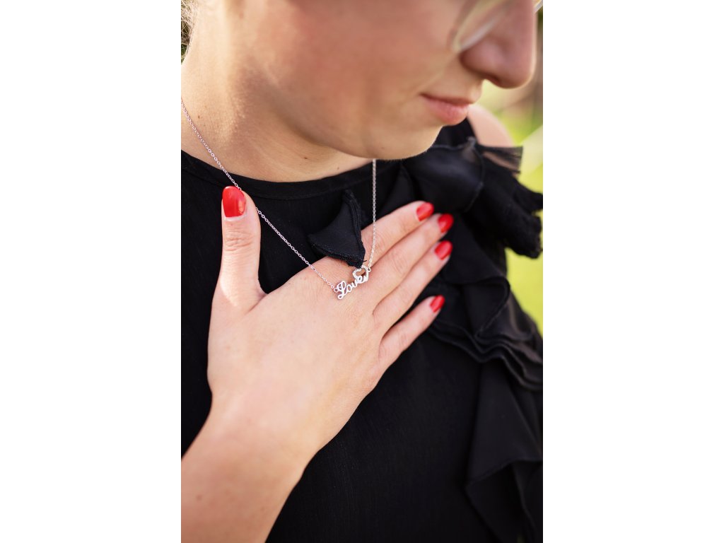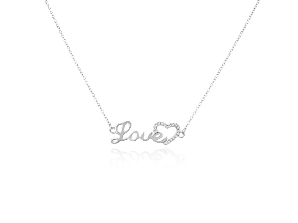 Jemný stříbrný řetízek zdobí ozdoba ve tvaru slova LOVE, doplněná o detail srdce dekorovaného čirými zirkony. Délku náhrdelníku lze nastavit na 42 cm s možností prodloužení o 5 cm, takže krásně padne. Tento šperk podtrhne váš styl a vnese do něj romantiku, jemnost a eleganci.