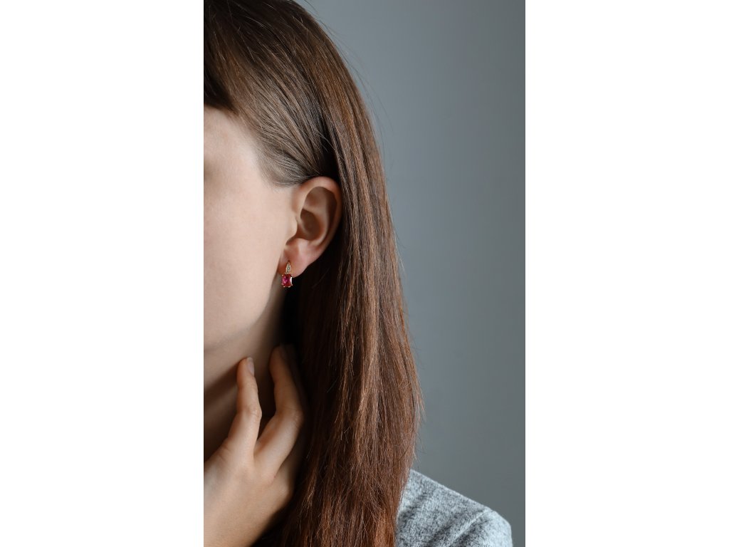 Náušnice jsou zdobeny precizně broušenými červenými a čirými zirkony, které dodávají oslnivý třpyt a živost barev. Klapkové zapínání zajišťuje bezpečné nošení a chrání před ztrátou. Tento šperk se stane oblíbeným doplňkem, jenž podtrhne ženskou eleganci a osobitý styl.