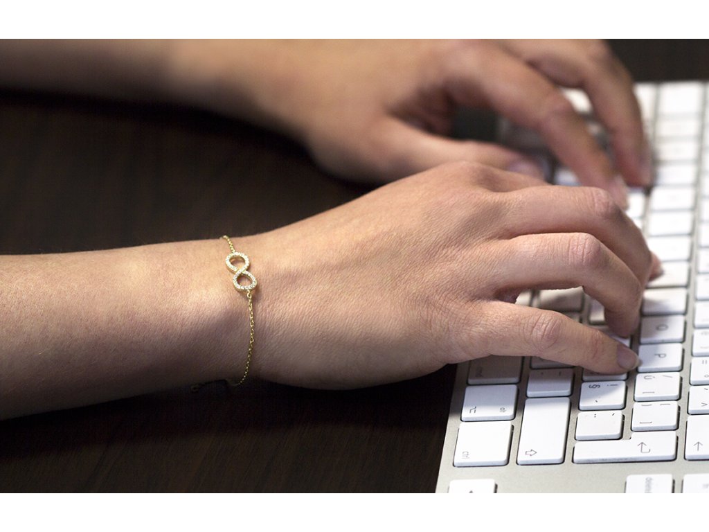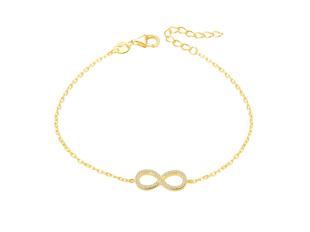 Náramek je vyroben z pravého stříbra a pozlacen žlutým zlatem, což mu dodává hřejivý a luxusní odstín. Symbol nekonečna je posázen čirými kamínky, které se nádherně lesknou. Díky nastavitelnému zapínání snadno přizpůsobíte délku tak, aby vám dokonale padl.