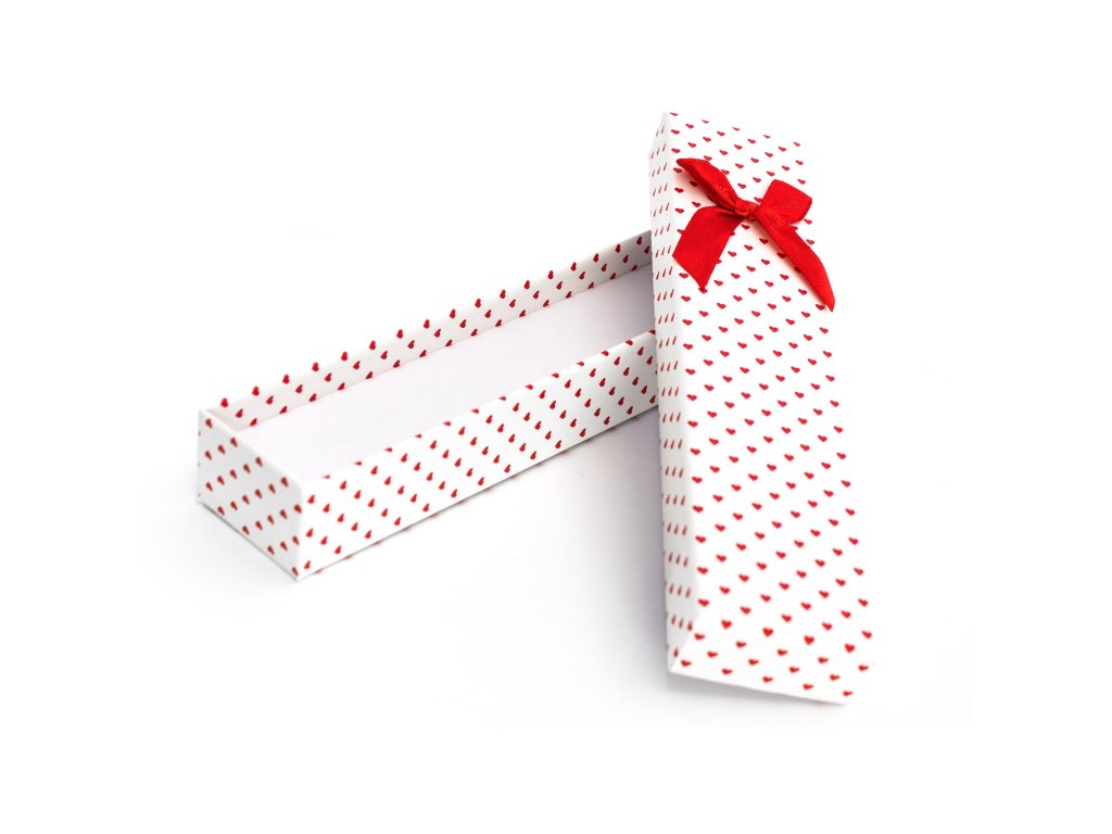 Romantická pevná papírová dárková krabička je ideální pro uložení náramku, řetízku i náhrdelníku. Má bílou barvu se vzorem srdíček a je ozdobena mašličkou. Uvnitř se nachází měkká bílá poduška, která šperky bezpečně ochrání.