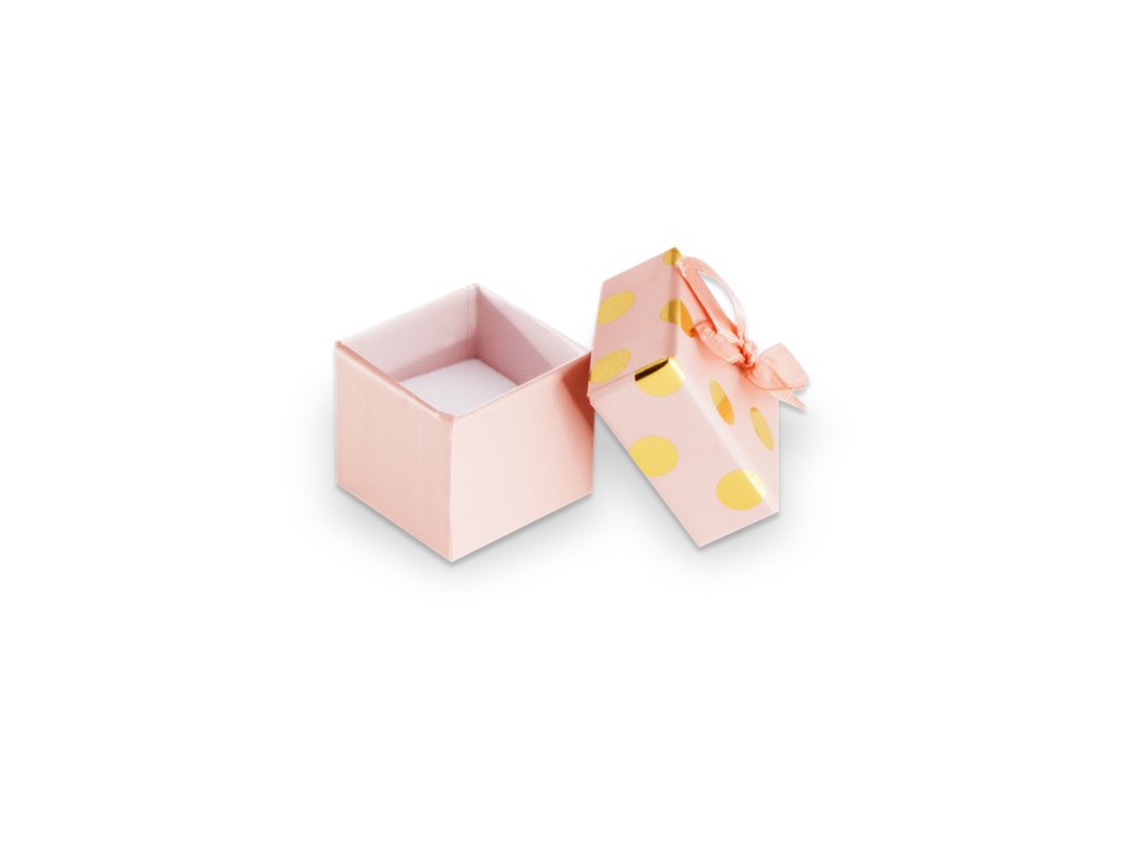 Pevná papírová dárková krabička je ideální pro uložení prstenu, přívěsku nebo drobných náušnic. Krabička je v něžné růžové barvě se zlatými puntíky a zdobena romantickou mašličkou. Uvnitř se nachází měkká bílá poduška, která šperky bezpečně ochrání.
