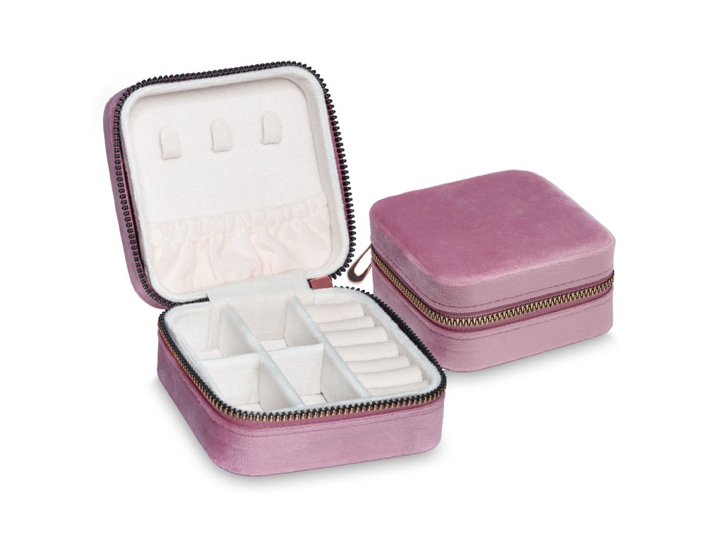 Přenosná, velice praktická šperkovnice v růžové barvě. Samet má luxusní vzhled a je velmi příjemný na dotek. Tuto šperkovnici oceníte také při cestování. Dokonale ochrání šperky před vlhkostí a poškrábáním. Barva zipu je zlatá.