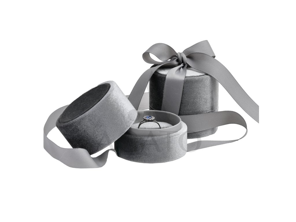 Krásná šedá sametová krabička se stužkou, určená pro prsten. Má velmi luxusní vzhled.