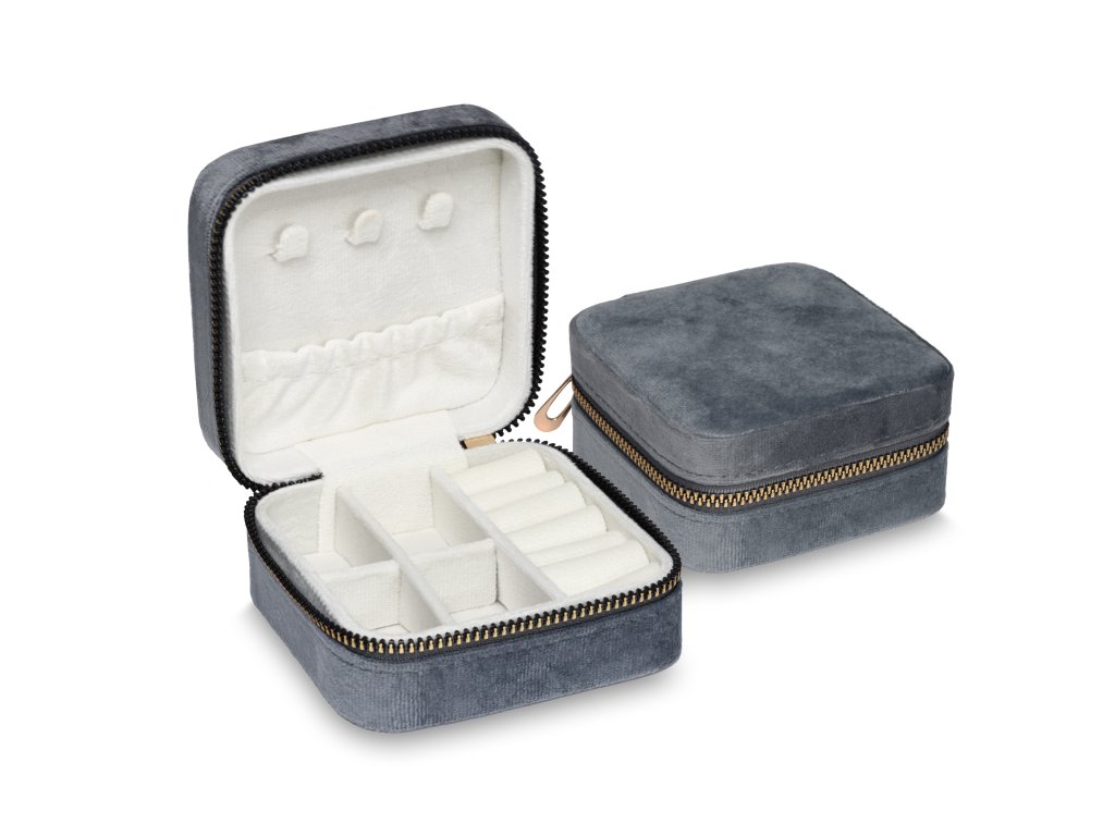 Přenosná, velice praktická šperkovnice v šedé barvě. Samet má luxusní vzhled a je velmi příjemný na dotek. Tuto šperkovnici oceníte také při cestování. Dokonale ochrání šperky před vlhkostí a poškrábáním. Barva zipu je zlatá.
