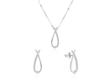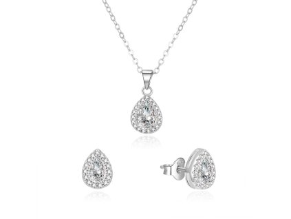Oslnivá stříbrná souprava se zirkony Souprava z velmi kvalitního stříbra zahrnuje přívěsek a peckové náušnice zdobené čirými zirkony, které dodávají šperkům jemný, oslnivý...