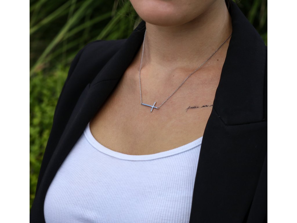 Vodorovně uložený křížek představuje originální zpracování klasického motivu. Náhrdelník je vyroben ze stříbra a délku lze nastavit na 42 cm + 5 cm, takže padne každé ženě. Díky svému jemnému designu se hodí pro každodenní nošení i speciální příležitosti a stane se oblíbeným kouskem ve vaší šperkovnici.