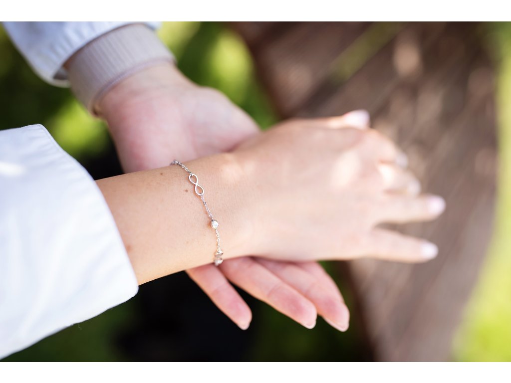 Šperk je vyroben z pravého stříbra a zdobený precizně vybroušenými korálky. Ozdoba ve tvaru nekonečna podtrhne vaši přirozenou krásu a stane se oblíbeným doplňkem pro každou příležitost. Díky nastavitelné délce 17–21 cm padne pohodlně každé ženě
