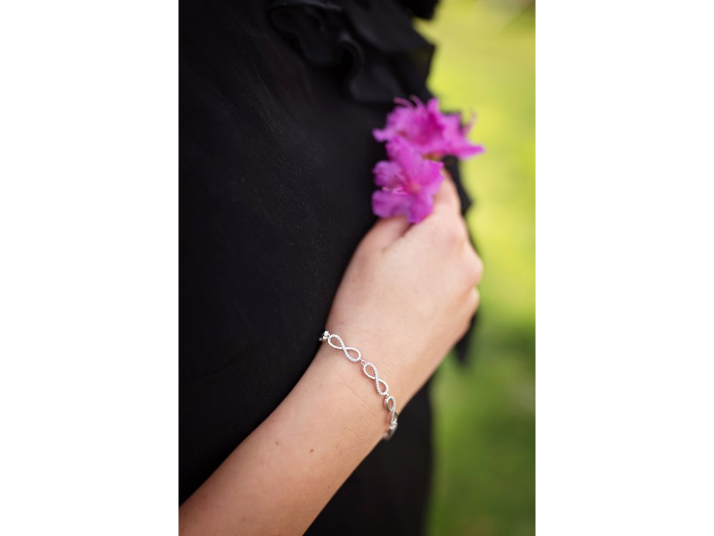 Symbol nekonečna zdobený čirými zirkony se při každém pohybu nádherně rozzáří a přitáhne pozornost. Povrch je rhodiovaný, aby si náramek uchoval stálý lesk a byl chráněný proti zčernání. Díky délce 17+4 cm jej snadno přizpůsobíte svému zápěstí a budete ho nosit s lehkostí a radostí.