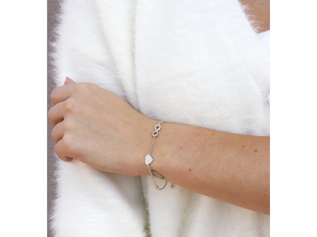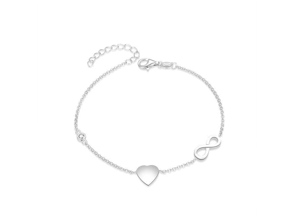 Stříbrný náramek se symboly lásky s rhodiovaným povrchem, udržuje lesk a snižuje riziko alergií. Náramek má délku 17 cm s možností prodloužení až o 4 cm, zapínání na karabinu zajišťuje praktické a bezpečné nošení. Tento náramek je malý kousek elegance, který dodá outfitu jemný třpyt a nadčasový šarm.