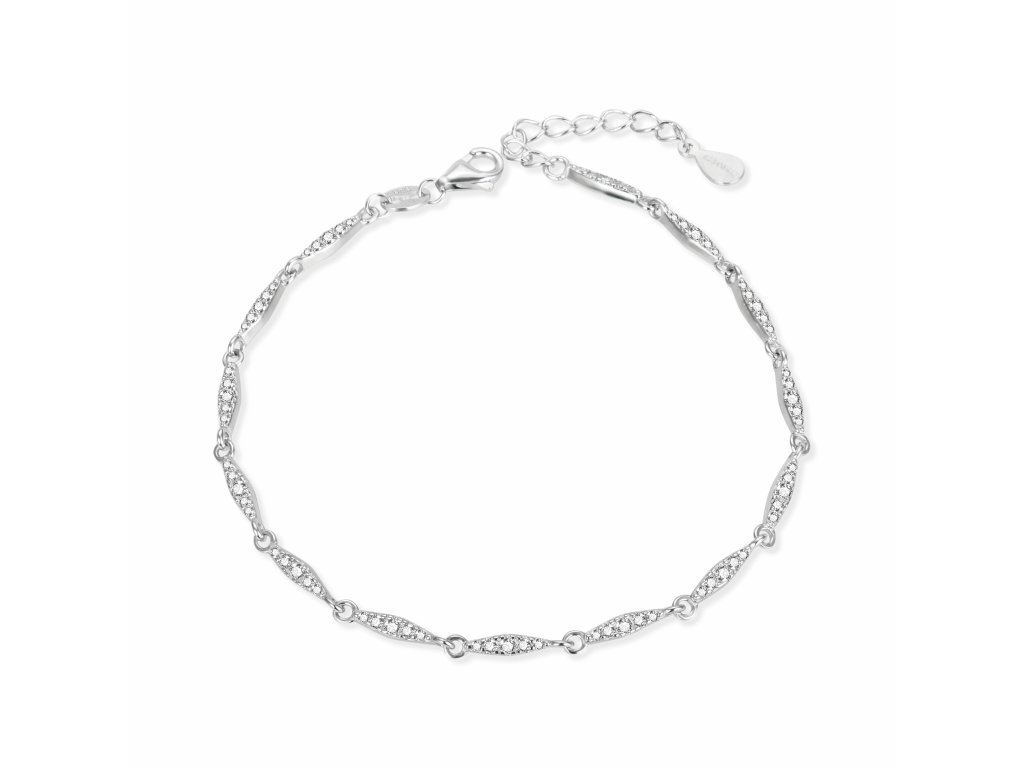 Dámská nastavitelný náramek zdobí čiré zirkony, které dodají náramku oslnivý třpyt a jemný design. Díky možnosti prodloužení až o 4 cm, a praktickému zapínání na karabinu zajišťuje komfortní a bezpečné nošení. Náramek je promšlný do posledního detailu, aby krásně vypadal a dobře se nosil.