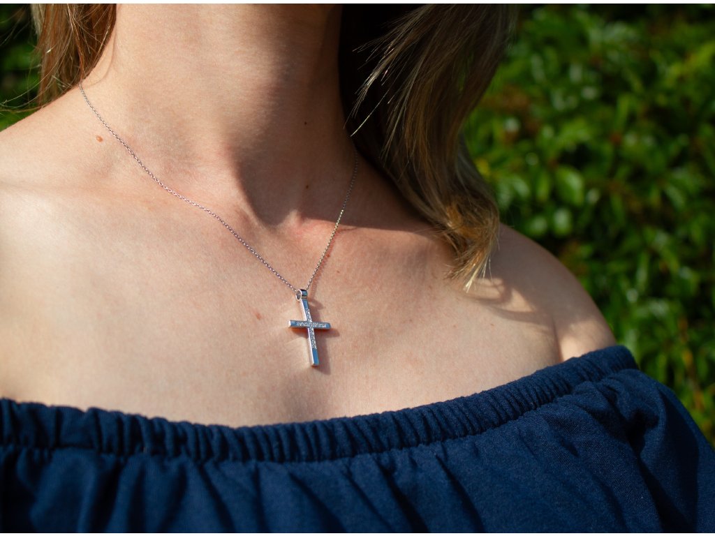Vyrobený z kvalitního stříbra, přívěsek spojuje odolnost a sofistikovaný vzhled. Křížek symbolizuje víru, ochranu a naději, zatímco třpytivé zirkony dodávají šperku jemný a zářivý detail. Ideální volba jako osobní talisman nebo dárek, který vnese do outfitu pocit elegance a klidu.