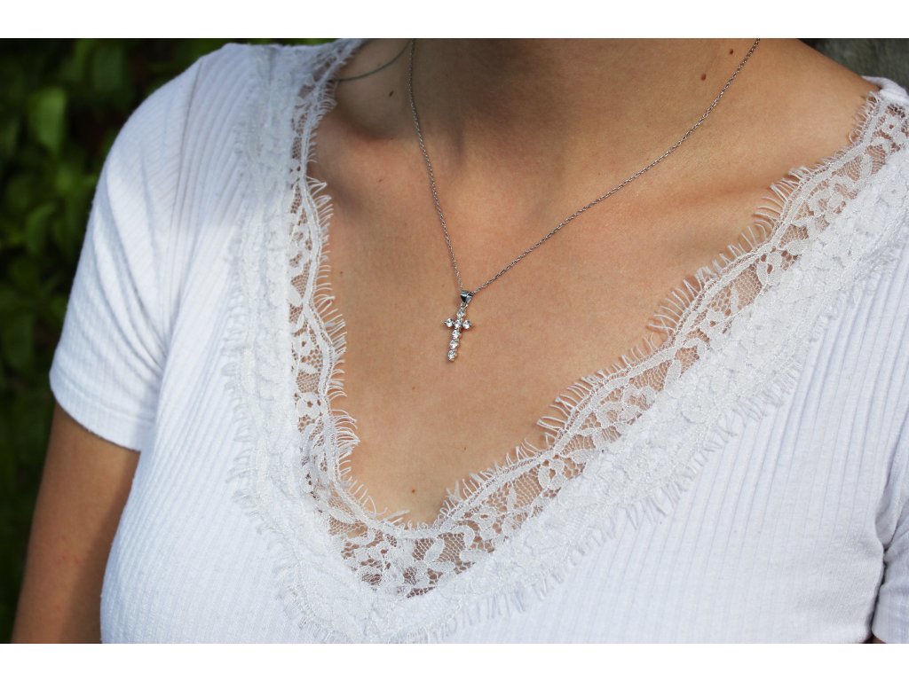 Vyrobený z kvalitního stříbra, přívěsek spojuje odolnost a sofistikovaný vzhled. Křížek symbolizuje víru, ochranu a naději, zatímco třpytivé zirkony dodávají šperku jemný a zářivý detail. Perfektní volba jako osobní talisman nebo jako dárek, který vnese do outfitu třpyt a nadčasový styl.