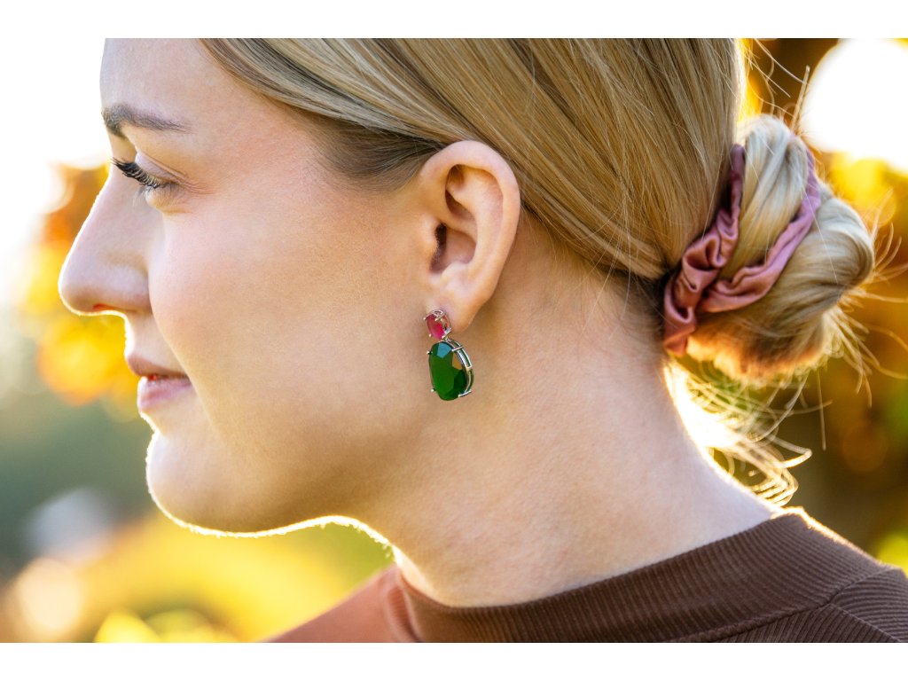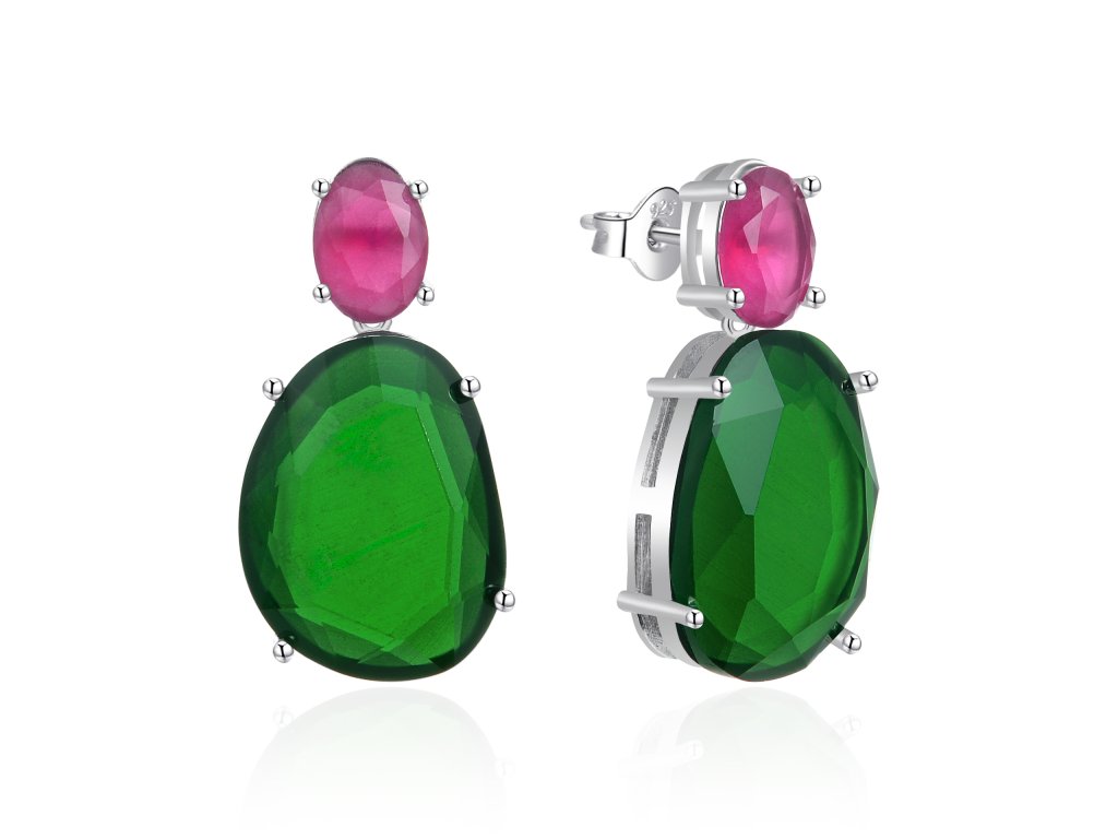 Díky pohodlnému zapínání na puzetku náušnice pevně drží na uchu a zajišťují komfortní nošení. Kombinace barevného skla a stříbra vytváří elegantní a univerzální doplněk, ideální pro ženy, které hledají moderní a třpytivý šperk, nebo jako dárek, který vnese do outfitu jemný třpyt a hravý detail.